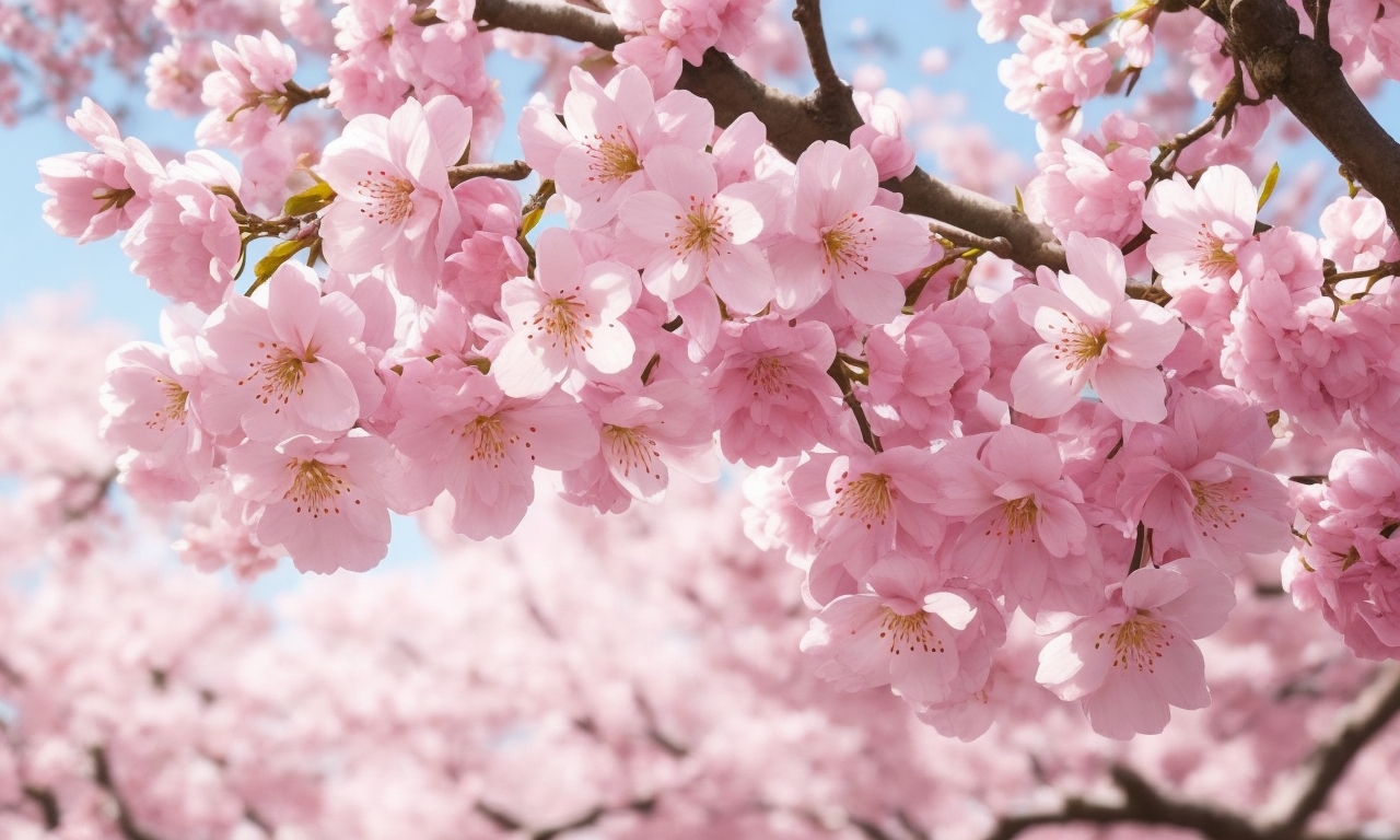 A serene spring scene with cherry blossoms in full bloom. The delicate pink petals cascade from the trees, creating a romantic atmosphere. The vibrant blossoms contrast with the lush greenery, capturing the essence of renewal and love in springtime