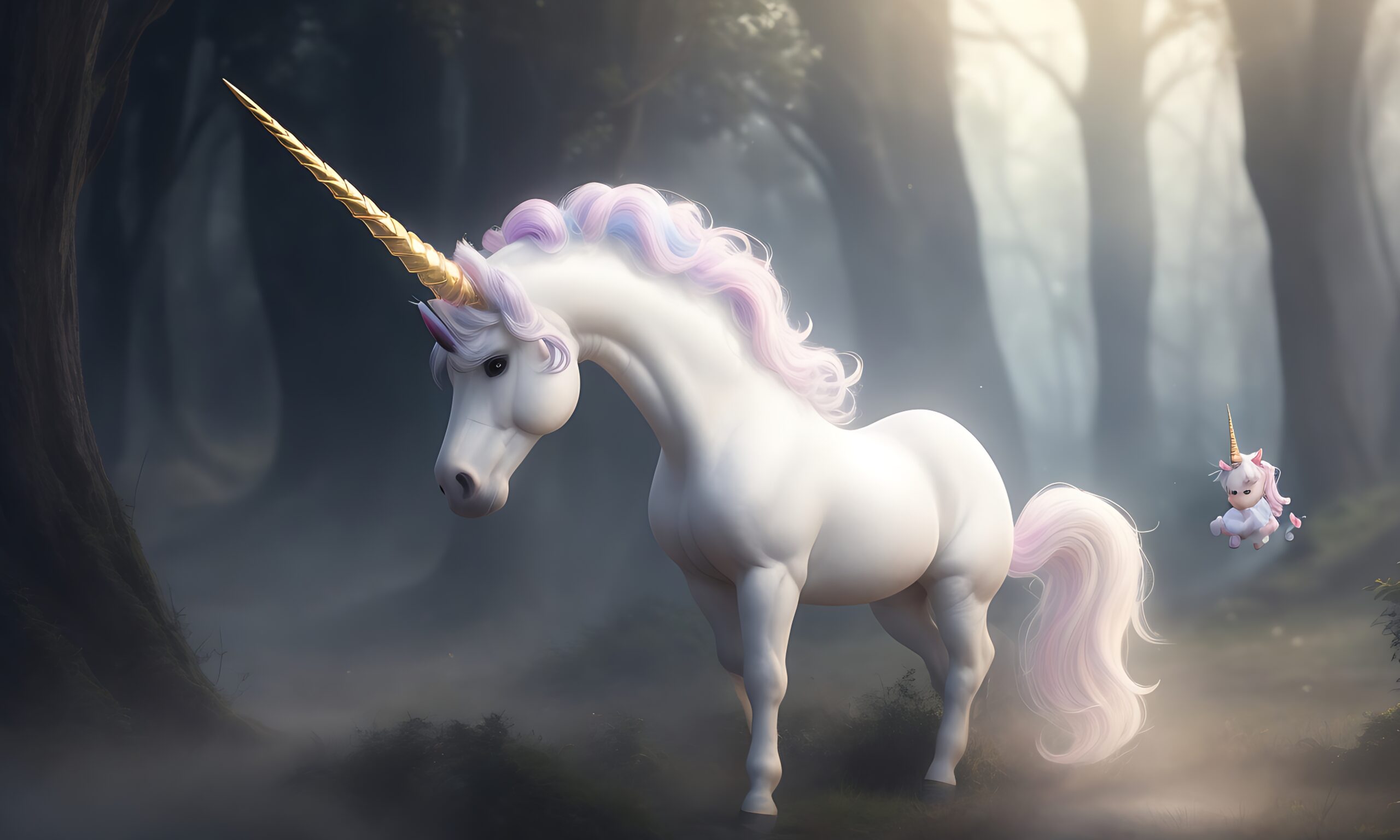 This enchanting image depicts a majestic unicorn with a golden horn and a flowing, pastel-colored mane in a misty, mysterious forest. The scene is further enhanced by the presence of a smaller, magical unicorn, adding a touch of whimsy and wonder to the ethereal atmosphere. The contrast between the large, graceful unicorn and the tiny, adorable one creates a captivating dynamic, making the image perfect for fantasy lovers and those who appreciate magical, otherworldly art.