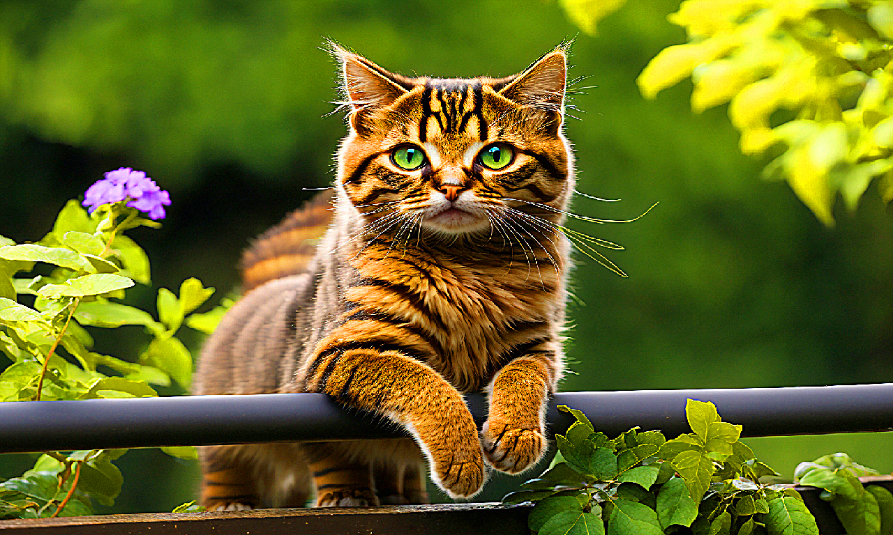 Focused Feline Balance: Tabby Cat on Garden Fence