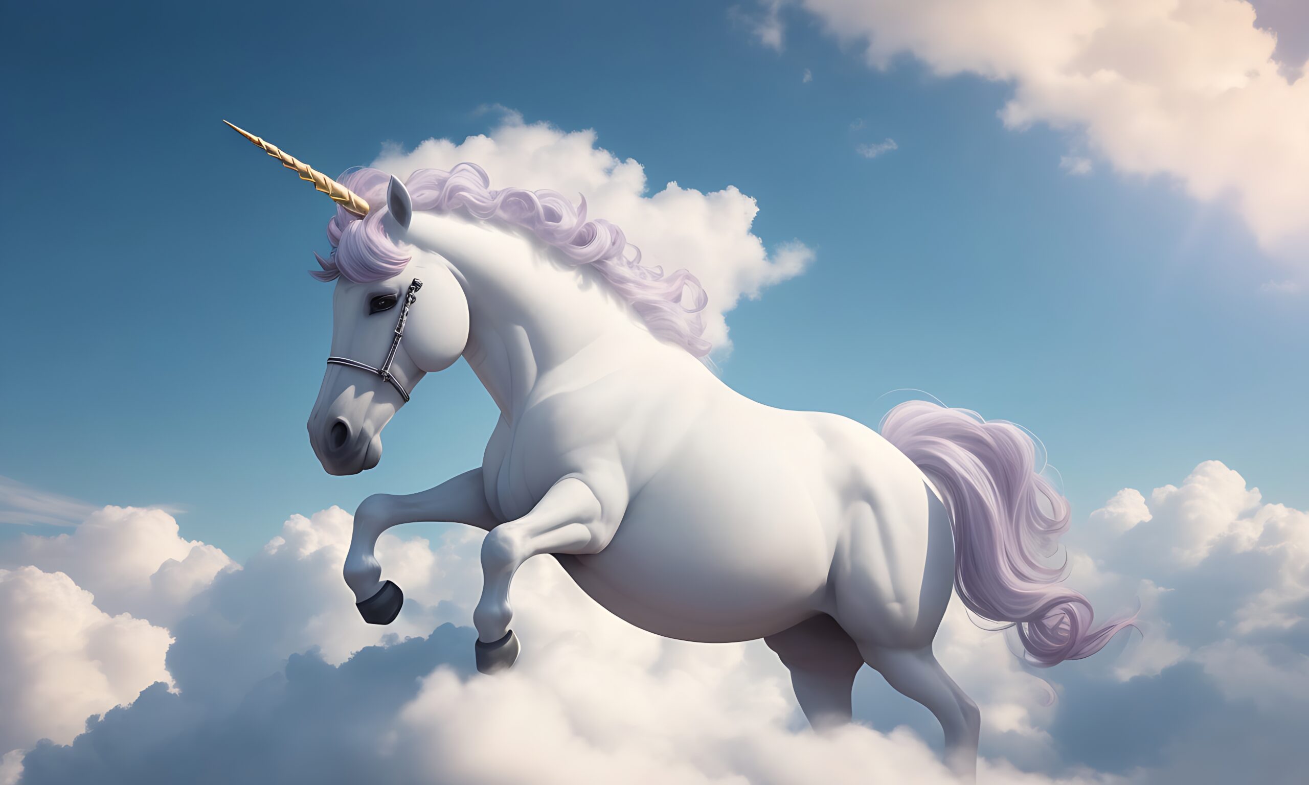 Experience the magical allure of a majestic unicorn with a golden horn, gracefully soaring above the clouds against a clear blue sky. This captivating image embodies fantasy and wonder, perfect for those who dream of mythical adventures in the skies